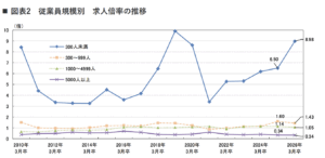 少子高齢化による労働人口の減少は年々深刻さを増しています。リクルートワークス研究所の調査によれば、2025年3月卒業予定者の大卒求人倍率は従業員300人未満の中小企業で6.50倍に達し、従業員5,000人以上の大企業では0.34倍と大きな開きがありました。さらに翌年の2026年卒では中小企業の求人倍率が8.98倍にまで急上昇しており、1人の求職者を約9社が奪い合う計算になります。